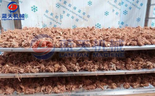 2:先將采收的文山三七挑選裝盤,使用不銹鋼托盤、合理均勻?qū)⑷邤[放至托盤架中,每層間隔約為10厘米至15厘米,不宜鋪放太多,擺放以通風透氣為佳,這樣每一層三七都能均勻受熱、干燥脫水。