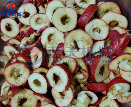 第二步:洗凈山楂果后,要盡快擦干其外表的水分,再進(jìn)行切片處理,需要去除或保留果核?,F(xiàn)在也有專門的切片機(jī)器,效率很高,且切片的厚薄均勻,一般在3mm左右。